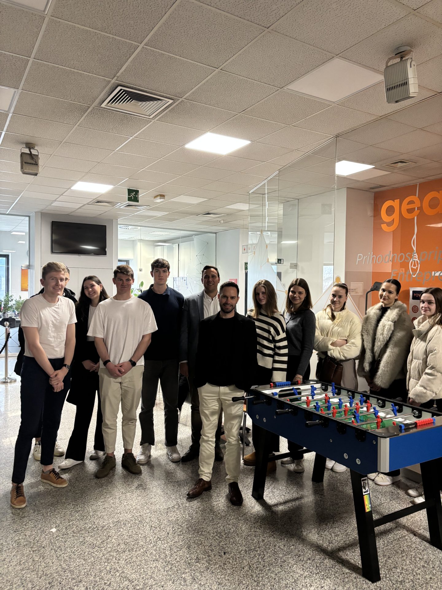 | Med ključnimi izkušnjami so bile vključitev v GEA College inkubator, sodelovanje v programu Erasmus Buddy ter prednost pri prijavah na mednarodne izmenjave. Študenti so lahko sodelovali v različnih podjetniških popoldnevih z uspešnimi podjetniki, kot so Blaž Vižentin, Marko Verdev, Anže Herbst, Aljaž Peklaj, Miha Lavtar in Nike Brajhovič Mihelič, ter spoznavali njihove zgodbe in pristope. Praktične delavnice so zajemale teme, kot so priprava življenjepisa in motivacijskega pisma, iskanje prakse, simulacija zaposlitvenega razgovora in spoznavanje poslovne kulture v mednarodnem okolju. Poleg tega so študenti imeli priložnost sodelovati pri različnih projektih, vključno s finančno nagrajenim projektom PUŠ ter nevromarketinškimi raziskavami. Obiskali so več podjetij, med njimi ExtraLux, Marles in Teta Frida, ter sodelovali na konferencah in poslovnih dogodkih, kot so RoglIT205, ABSRC, MEN-TAL, Bloomberg Adria Future Fusion Summit in Gospodarska zbornica Slovenije. Kulturni in družabni momenti niso manjkali – kulinarične delavnice na Dvoru Jezeršek, ekskurzija v Državni zbor ter zaključni izlet v Piranski zaliv s predstavitvijo družinskega podjetja Ribogojnica Fonda so študentom omogočili tudi sproščeno druženje in mreženje. |